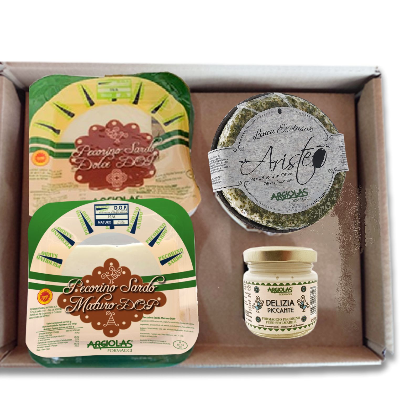 Scatola in cartone con chiusura a gancio e adesivo Argiolas Formaggi
